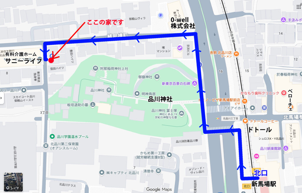 2つ目の駅「新馬場」北口下車、徒歩4〜5分の場所です。
