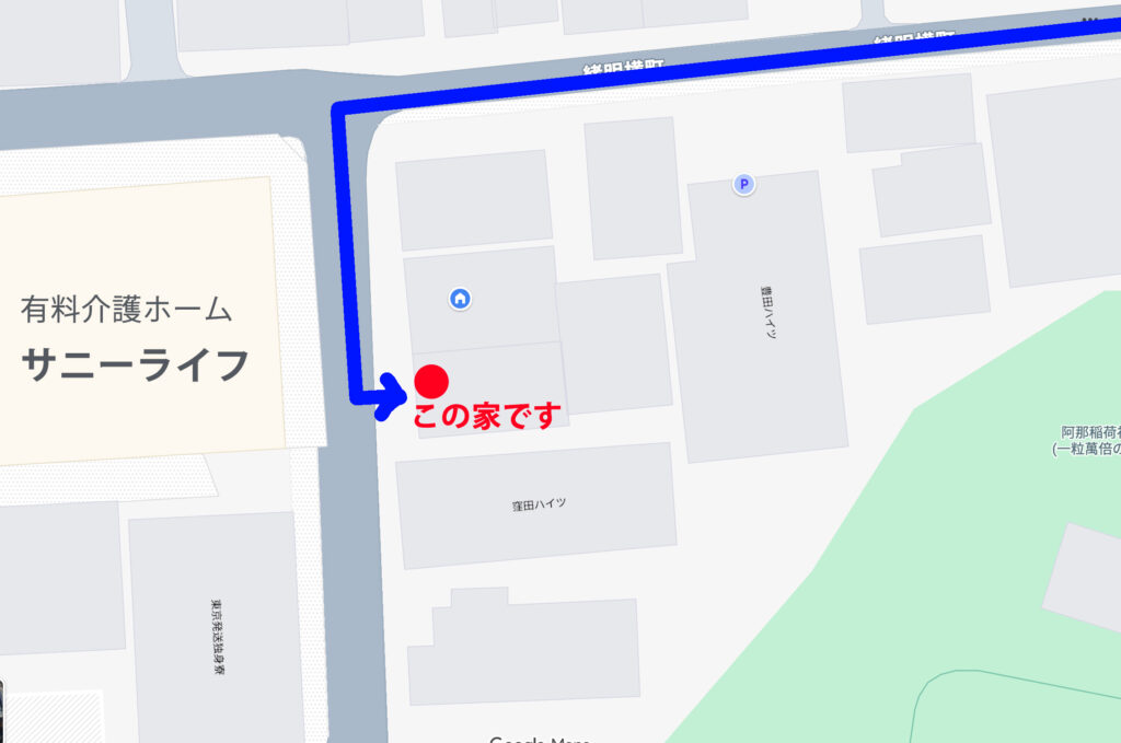 左手斜め前に「有料介護老人ホーム サニーライフ」が見えたら左へ折れて、3件目