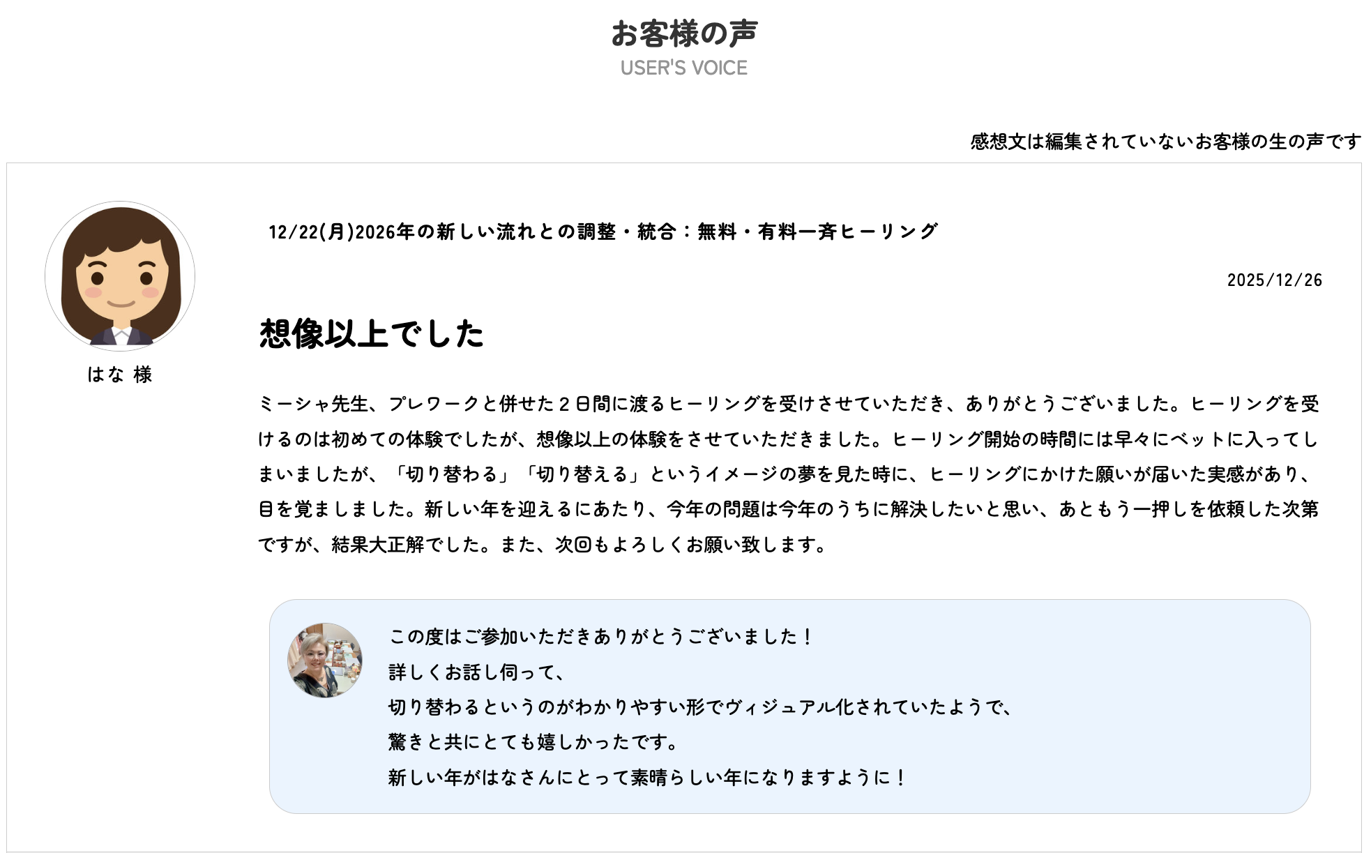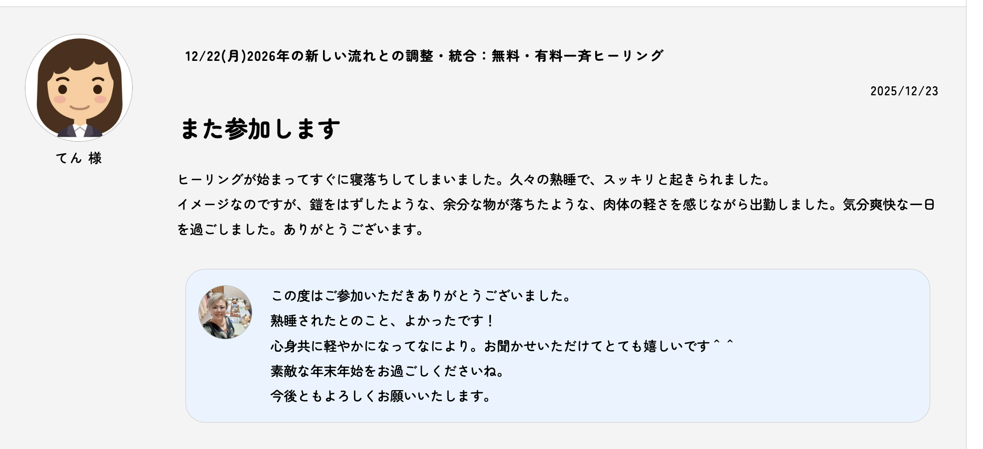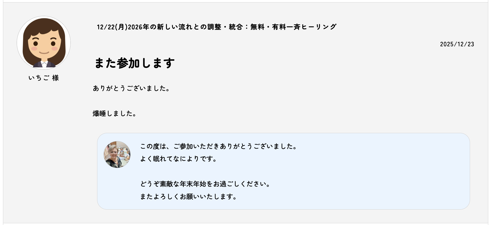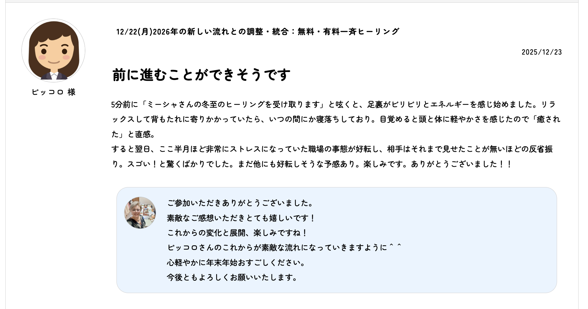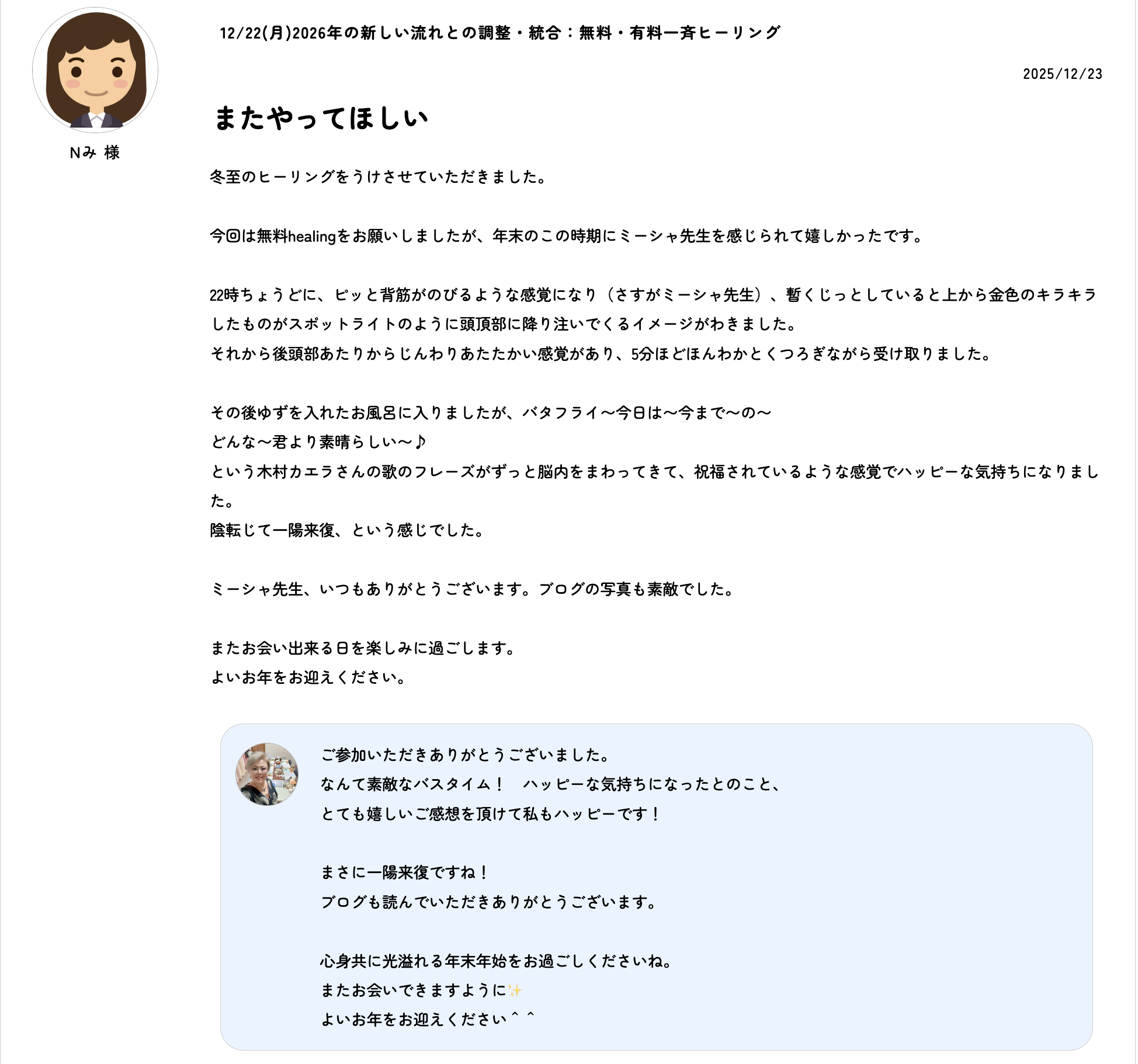 今回は無料healingをお願いしましたが、年末のこの時期にミーシャ先生を感じられて嬉しかったです。